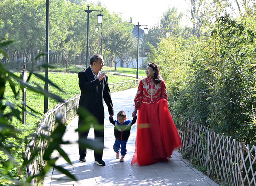 在河北省石家庄市栾城区一公园,老人身着婚纱礼服,共度浪漫重阳。